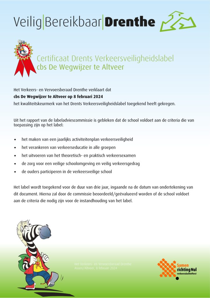 Elke drie jaar worden we door de provincie beoordeeld op de verkeersveiligheid in en om de school. Als school moet je voldoen aan een aantal punten om in aanmerking te komen voor het Drents Veiligheidslabel (DVL). Onlangs hebben we de hercertificering ontvangen.
